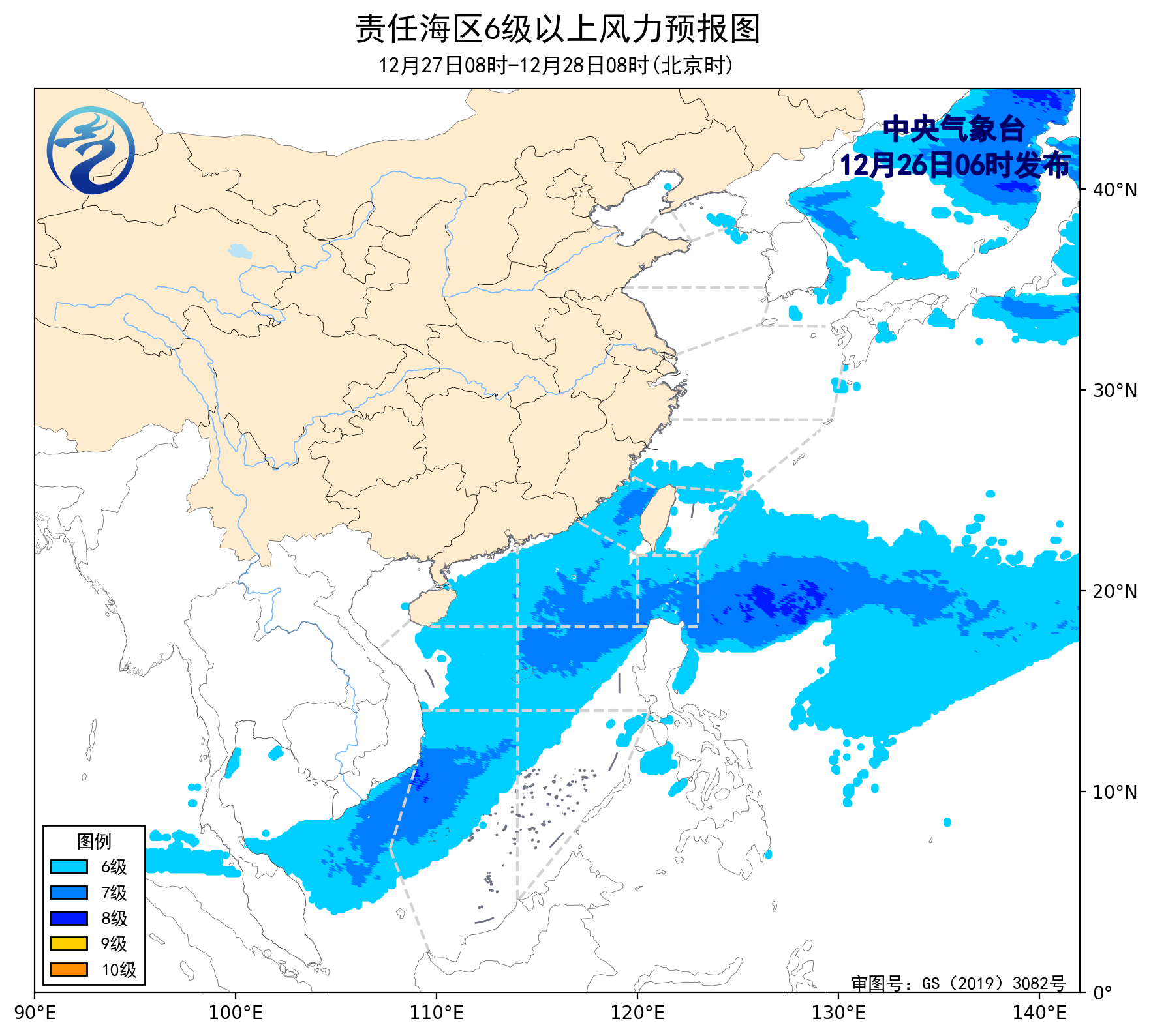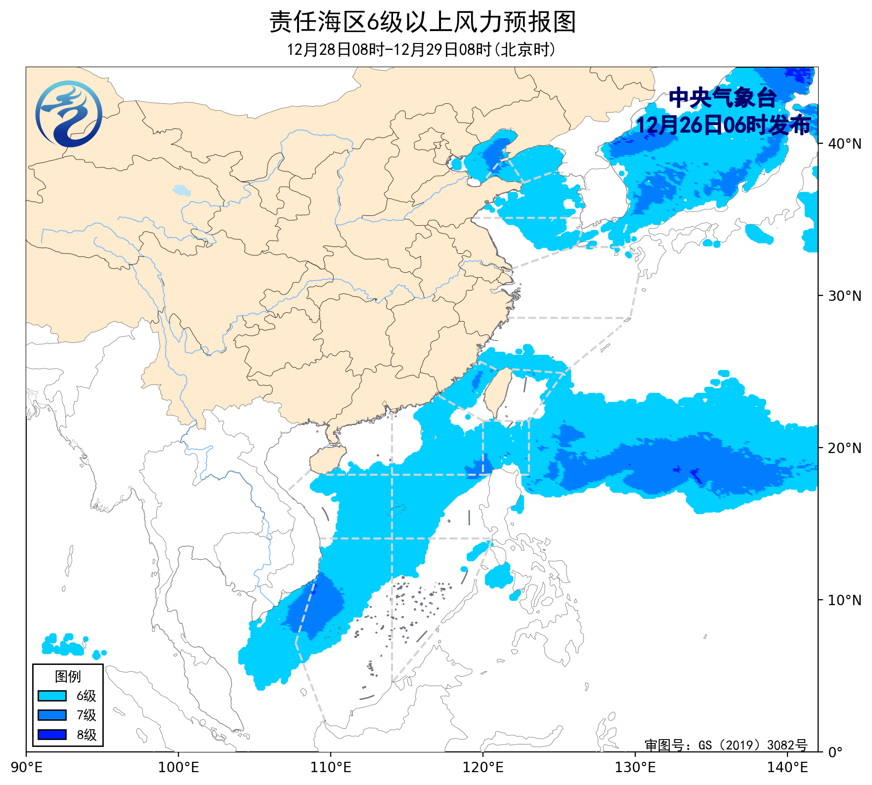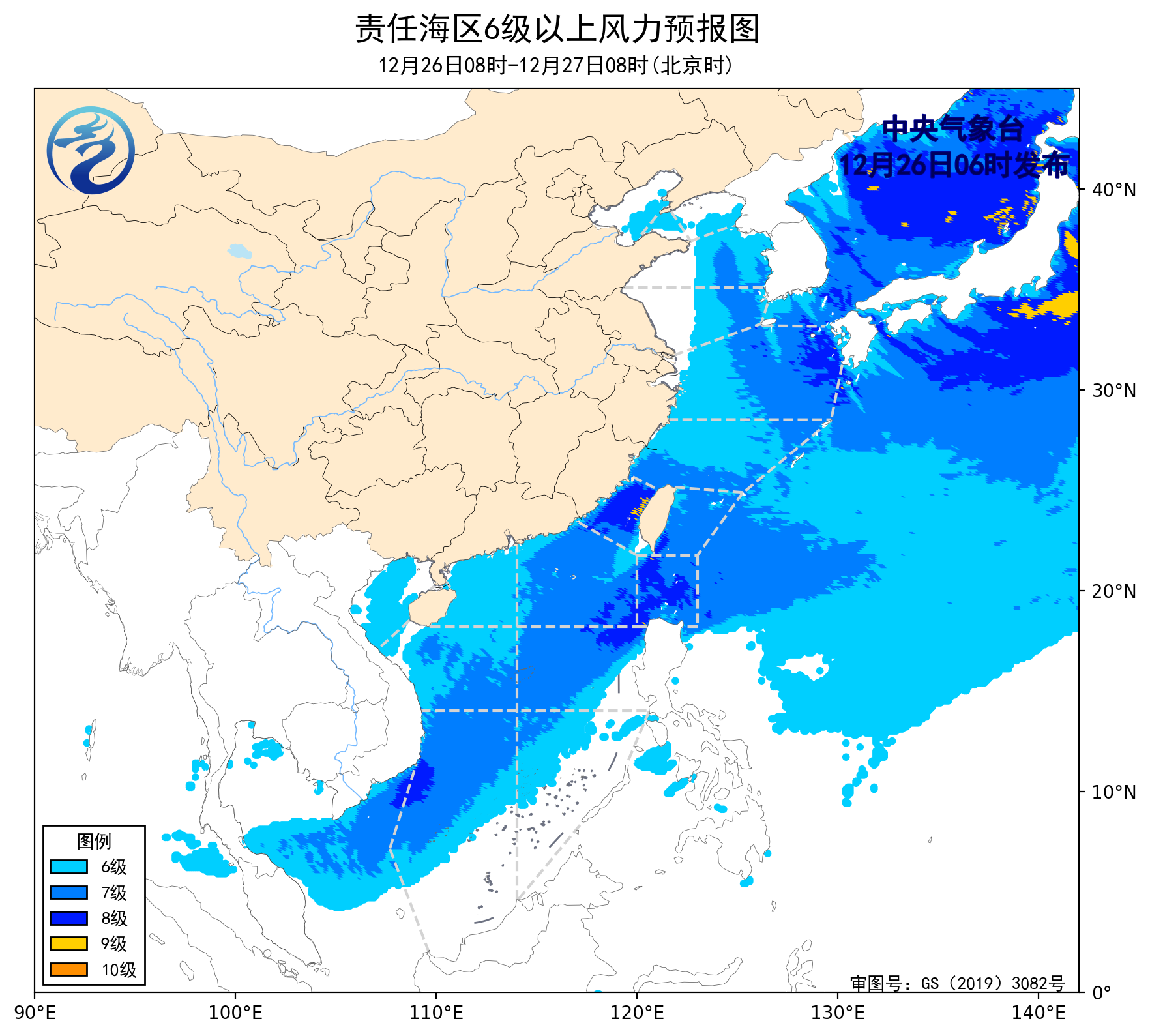26日08時至27日08時,東海大部海域、台灣海峽、巴士海峽、台灣以東洋面,南海大部海域將有6~8級、陣風9級的大風,其中台灣海峽部分海域風力可達9級、陣風10級,黃海中部和南部海域將有6~7級、陣風8級的偏北風,渤海海峽將有4級以下增大到5~6級、陣風7級的西南風,黃海北部海域將有4~6級、陣風7級的西北風到偏西風,北部灣將有4~6級、陣風7級的東北風。
