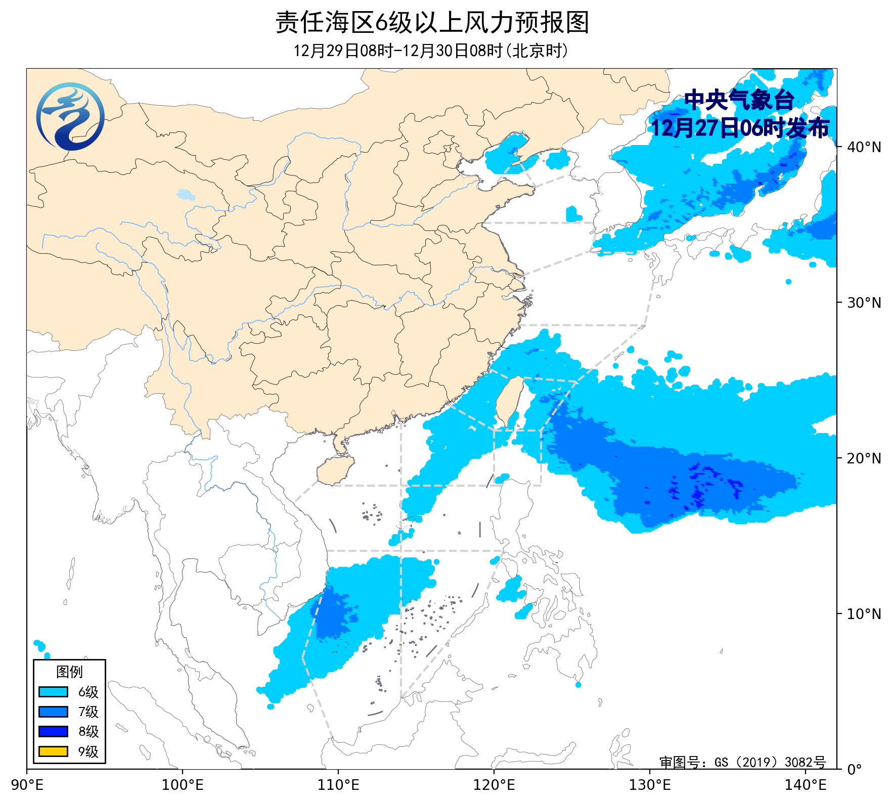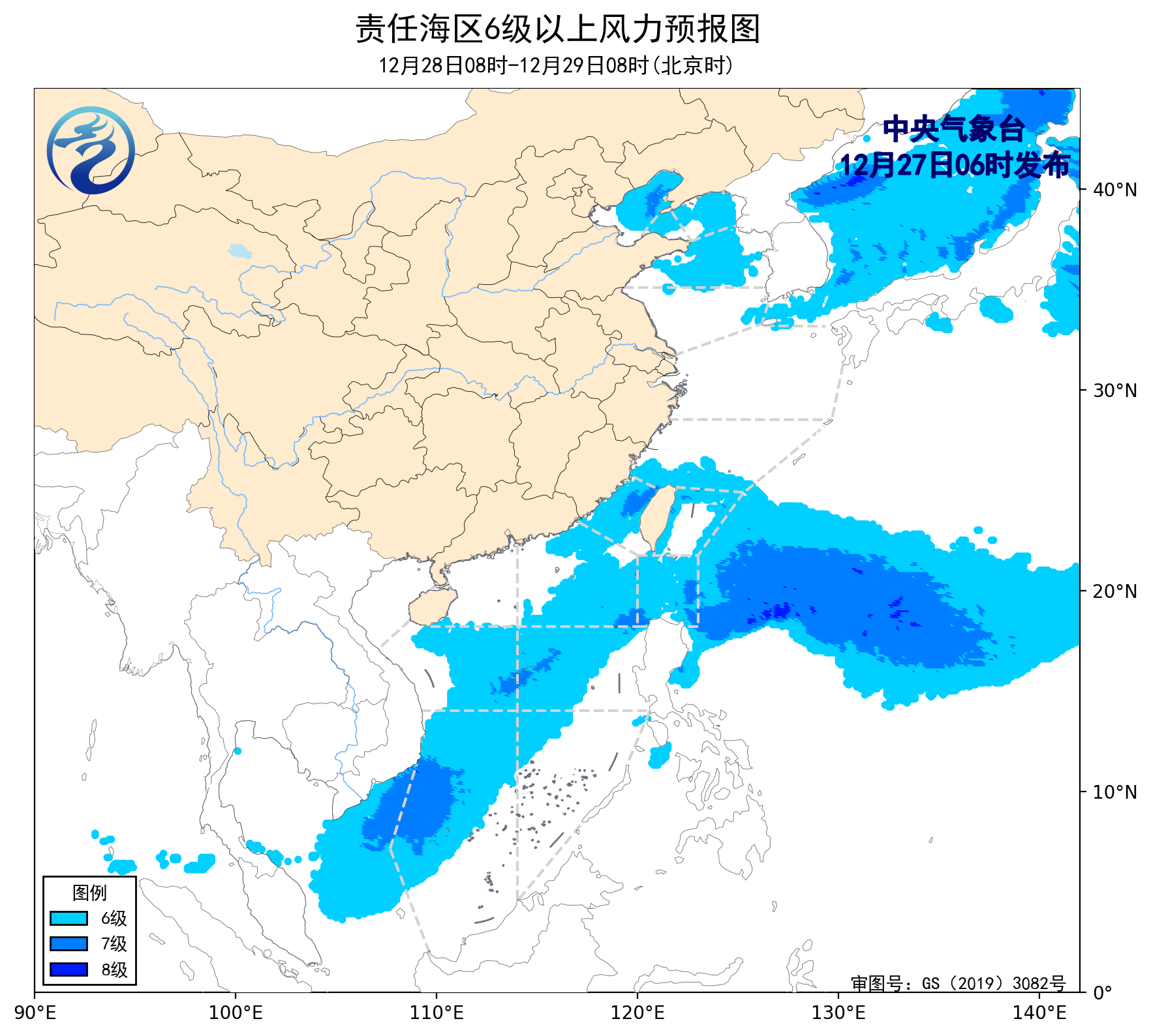 27日08時至28日08時,台灣海峽、巴士海峽、南海東北部、中東部和南海西南部海域將有6~7級、陣風8級的東北風,東海南部海域、台灣以東洋面、南海西北部、中西部和南海東南部海域將有5~6級、陣風7級的偏北到東北風。
