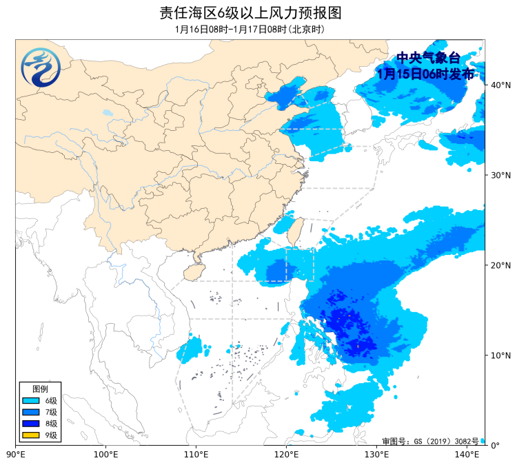 16日08時至17日08時,渤海、黃海中部海域、巴士海峽、南海東北部海域將有6~7級、陣風8級的偏東到東北風,渤海海峽、黃海北部和南部海域、台灣海峽將有4~6級、陣風7級的偏北到東北風。