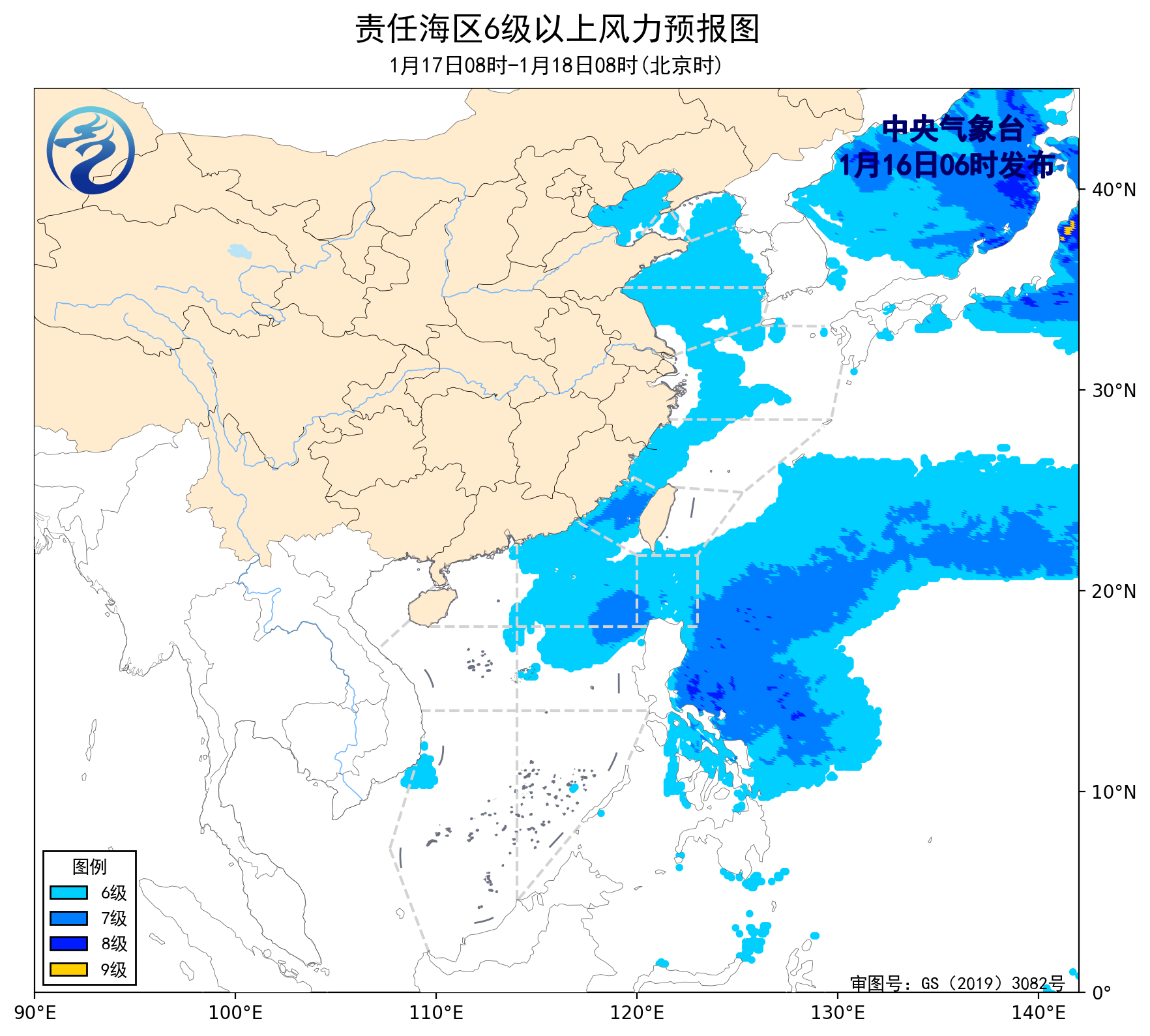 16日08時至17日08時,渤海、渤海海峽、黃海北部和中部海域將有5~7級、陣風8級的偏北到東北風,黃海南部海域、台灣海峽、巴士海峽、南海東北部海域將有4~6級、陣風7級的偏東到東北風。山東半島沿岸海域、黃海西南部海域、東海西部海域、長江口及杭州灣附近海域、舟山群島附近海域、南海西北部海域、瓊州海峽、北部灣北部、雷州半島沿岸海域將有輕霧,能見度不足10公里。