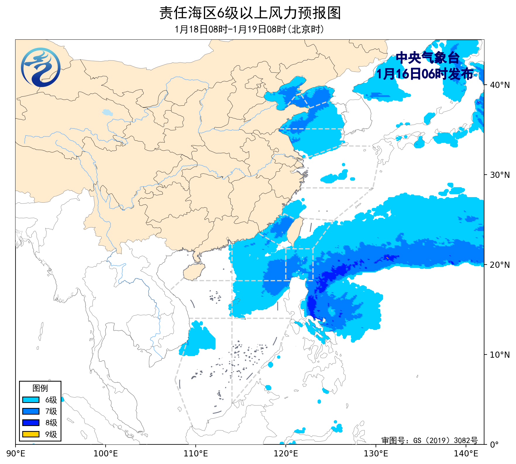 18日08時至19日08時,渤海、台灣海峽、巴士海峽、南海東北部和中東部海域將有5~7級、陣風8級的東北風,渤海海峽、黃海北部海域將有4~5級的偏北風增大到6~7級、陣風8級的東北風,黃海中部和南部海域、台灣以東洋面將有4~6級、陣風7級的偏北到東北風。