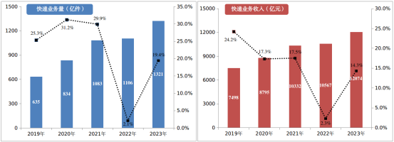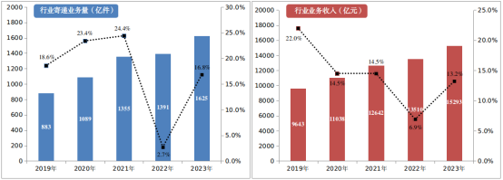 2023年郵政行業寄遞業務量完成1624.8億件,同比增長16.8%。其中,快遞業務量完成1320.7億件,同比增長19.4%。