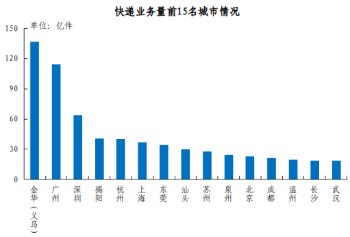 快遞業務量排名前十五位的城市依次是金華(義烏)、廣州、深圳、揭陽、杭州、上海、東莞、汕頭、蘇州、泉州、北京、成都、溫州、長沙和武漢,其快遞業務量合計佔全部快遞業務量的比重達到49.3%。