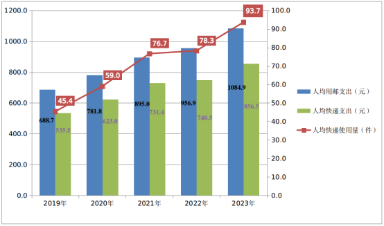 2019-2023年每人平均用郵支出、快遞支出和快遞使用量情況