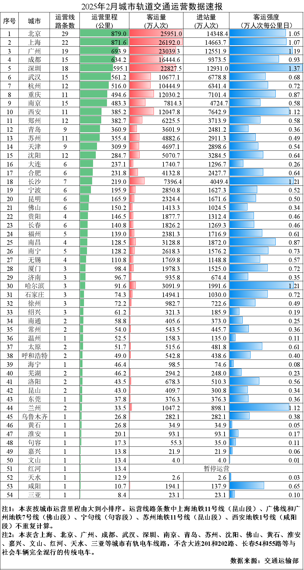 2025年2月,31個省(自治區、直轄市)和新疆生産建設兵團共有54個城市開通運營城市軌道交通線路326條,運營里程10975.8公里,實際開行列車330萬列次,完成客運量24.0億人次,進站量14.4億人次。2月份,客運量環比減少0.8億人次,減少3.2%,同比增加3.5億人次,增加17.1%。2月份全國總運營里程的平均客運強度為0.782萬人次每公里日,環比增加7.0%,同比增加12.8%。