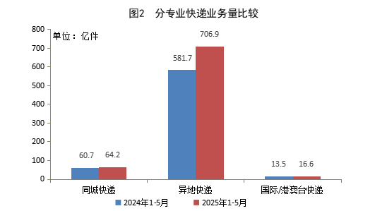 1-5月,同城快遞業務量累計完成64.2億件,同比增長5.8%;異地快遞業務量累計完成706.9億件,同比增長21.5%;國際/港澳臺快遞業務量累計完成16.6億件,同比增長22.4%。