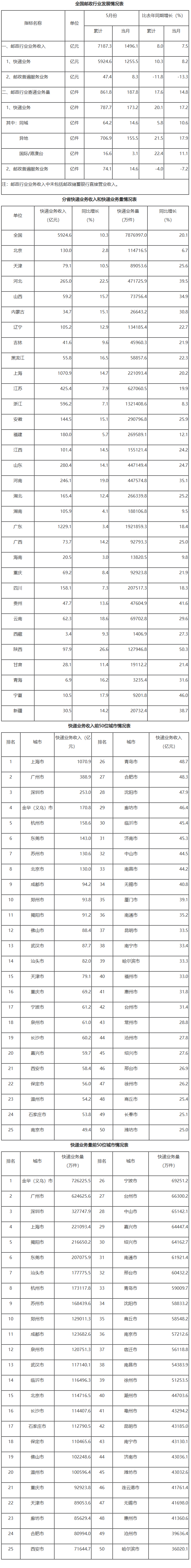 1-5月,郵政行業業務收入累計完成7187.3億元,同比增長8.0%。其中,快遞業務收入累計完成5924.6億元,同比增長10.3%。