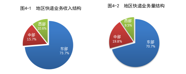 1-11月,東、中、西部地區快遞業務收入比重分別為73.7%、15.7%和10.6%,快遞業務量比重分別為70.7%、19.8%和9.5%。與去年同期相比,東部地區快遞業務收入比重下降1.2個百分點,快遞業務量比重下降1.7個百分點;中部地區快遞業務收入比重上升0.8個百分點,快遞業務量比重上升1.1個百分點;西部地區快遞業務收入比重上升0.4個百分點,快遞業務量比重上升0.6個百分點。