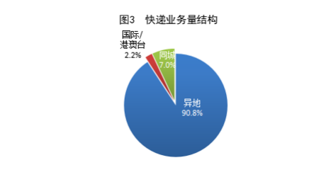 1-2月,同城、異地、國際/港澳臺快遞業務量分別佔全部快遞業務量的7.0%、90.8%和2.2%。與去年同期相比,同城快遞業務量的比重下降0.9個百分點,異地快遞業務量的比重上升1.0個百分點,國際/港澳臺業務量的比重下降0.1個百分點。