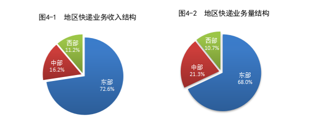 1-2月,東、中、西部地區快遞業務收入比重分別為72.6%、16.2%和11.2%,快遞業務量比重分別為68.0%、21.3%和10.7%。與去年同期相比,東部地區快遞業務收入比重下降0.9個百分點,快遞業務量比重下降3.2個百分點;中部地區快遞業務收入比重上升0.5個百分點,快遞業務量比重上升1.7個百分點;西部地區快遞業務收入比重上升0.4個百分點,快遞業務量比重上升1.5個百分點。