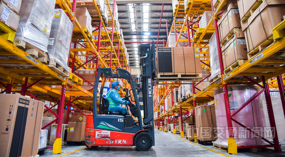 圖為叉車作業人員在上海機場集團倉儲中心作業。