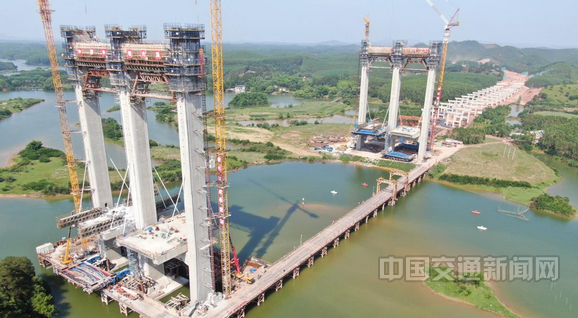 近日,廣西壯族自治區岑溪至大新公路橫縣至南寧段項目(簡稱南橫項目)重點控制性工程沙坪河大橋主塔封頂,轉入上部結構施工階段(如圖)。