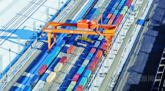 圖為同江北站換裝場內正在進行中歐班列換裝作業。