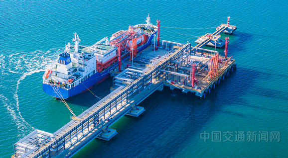 圖為該液體泊位進行首船乙烯裝船作業。