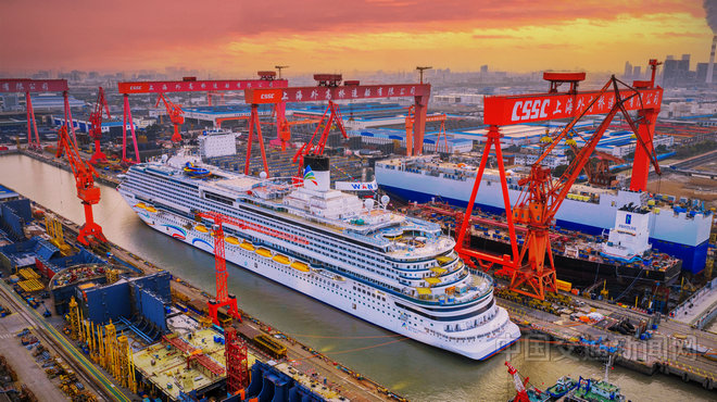 3月20日,第二艘國産大型郵輪“愛達·花城號”在中國船舶集團旗下上海外高橋造船有限公司順利出塢,轉入碼頭調試階段,全力衝刺年中試航、年底前完工交付的目標任務, “愛達·花城號”總噸位達14.19萬噸,總長341米、型寬37.2米,全船敷設電纜超過4700公里,擁有近4萬平方米的公共區域,匯聚了上千個系統、2萬餘套關鍵設備及超2500萬個零部件。全船能容納5200多名乘客,未來將以廣州南沙為母港開通國際航線。截至目前,郵輪工程總進度超94%,內裝完成81.9%,調試完成68.3%。
