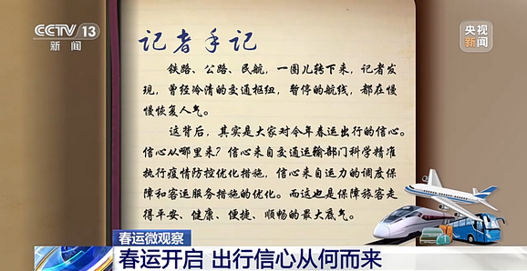 鐵路、公路、民航,一圈兒轉下來,記者發現,曾經冷清的交通樞紐、暫停的航線,都在慢慢恢復人氣。這背後,其實是大家對今年春運出行的信心。信心從哪來?信心來自交通運輸部門科學精準執行疫情防控優化措施,信心來自運力的調度保障和客運服務措施的優化。而這也是保障旅客走得平安、健康、便捷、順暢的最大底氣。