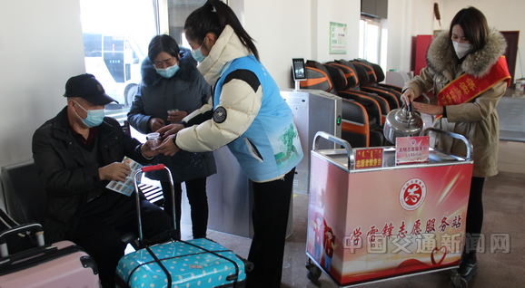 圖為鄂爾多斯市準格爾旗薛家灣客運站工作人員為旅客提供熱水、出行諮詢等服務。