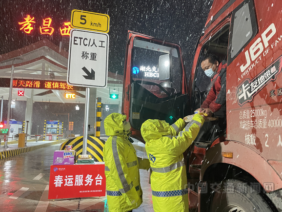 春節臨近,湖北高速公路車流量日益增多。湖北交投京珠運營公司在收費站開展“暖心行動”,為司乘提供熱水、泡麵、麵包以及維修工具等物資,發放行車指南,保障群眾順暢安全出行。