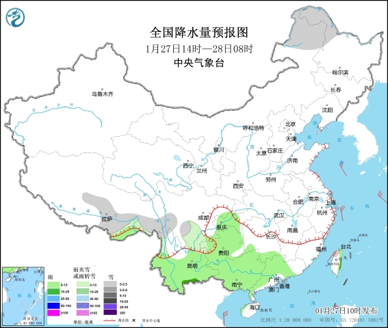 圖1 全國降水量預報圖(1月27日14時-28日08時)