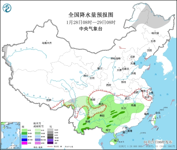 28日,內蒙古東北部、黑龍江中西部、新疆南疆西部山區、西藏東南部、川西高原南部、貴州西北部等地部分地區有小到中雪或雨夾雪;江南中西部、貴州、雲南、廣西等地有小到中雨(見圖2)。