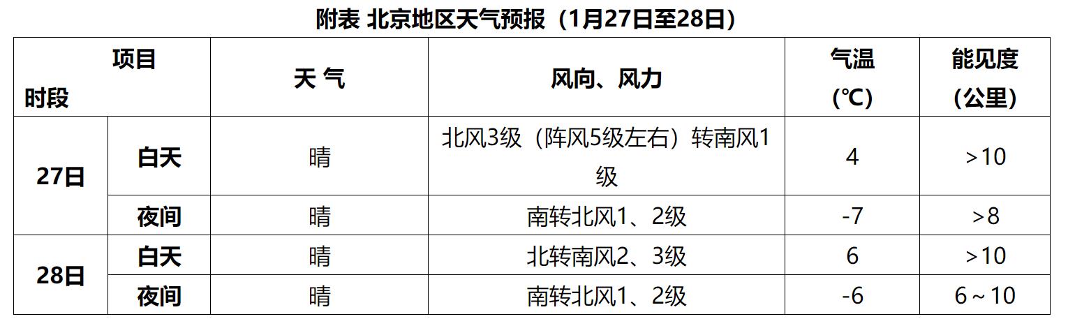 預計,27日至28日北京地區天氣晴,27日上午有3級偏北風,陣風5級左右;期間白天最高氣溫4~6℃,夜間最低氣溫-7~-6℃。具體預報見附表: