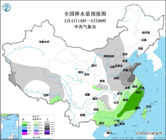 預計2月4日下午至5日下午,青藏高原大部、內蒙古中部、陜西中東部、華北大部、黃淮、江淮、江漢等地部分地區有小到中雪或雨夾雪;河南東部、安徽中北部、江蘇中北部、山東中東部等局地有大到暴雪;貴州中東部、湖南大部等地部分地區有凍雨;廣東北部等局地有大到暴雨。另外,江西北部、甘肅東南部、新疆北部等地局部道路受霧影響能見度低(見圖3,附件1)。