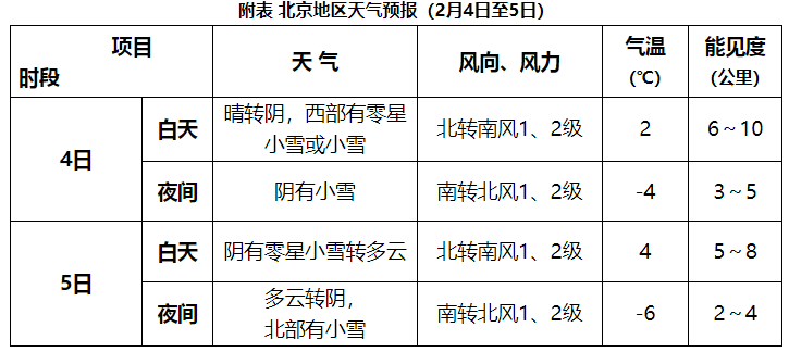 預計2月4日下午,北京地區天氣晴轉陰,4日傍晚至5日上午北京地區有小雪天氣,全市大部分地區降水量不足1毫米,房山、門頭溝、昌平、延慶部分地區降雪相對明顯,降水量2~3毫米;4日夜間為主要降雪時段,5日上午北京大部地區降雪減弱結束,5日夜間北部有小雪天氣。該期間風力不大,白天最高氣溫2~4℃,夜間最低氣溫-6~-4℃,夜間最低能見度2~3公里。