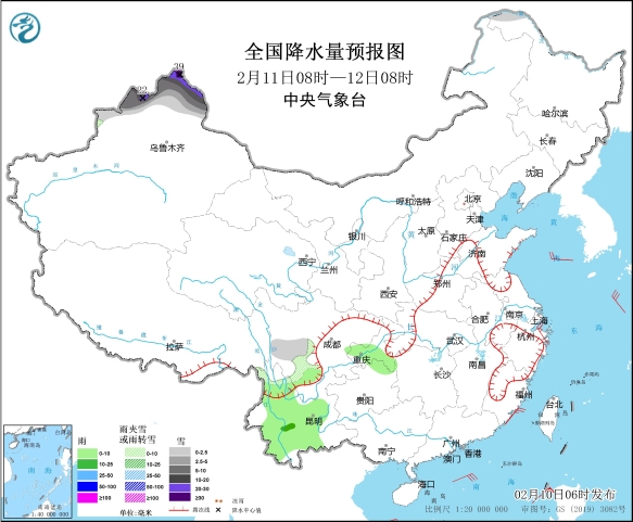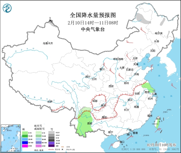 圖1 全國降水量預報圖(2月10日14時-11日08時)
