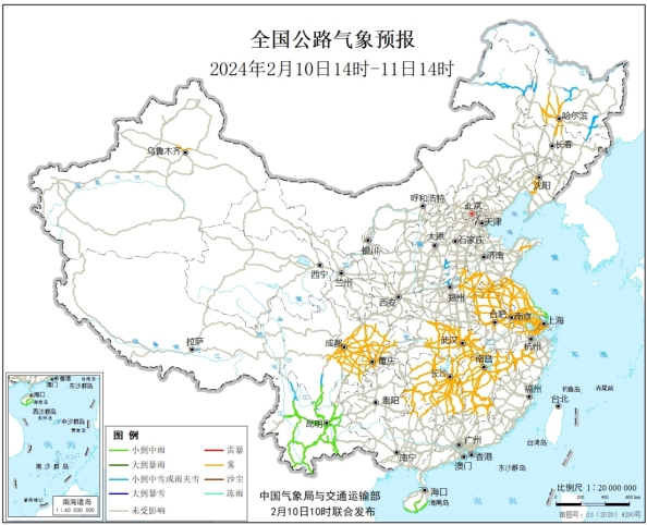 預計2月10日下午至11日下午,內蒙古東北部、黑龍江中西部和東南部、川西高原南部等地部分道路受小雪或雨夾雪影響;四川南部、雲南、江蘇中南部等地部分道路受小雨影響。另外,遼寧中部、吉林北部、黑龍江西南部、江蘇大部、浙江中北部、安徽中北部、江西大部、山東東部和南部、河南北部、湖北中東部、湖南大部、廣西北部、重慶西部、四川中東部、貴州東部等地部分道路受霧影響能見度低(見圖3,附件1)。