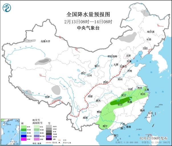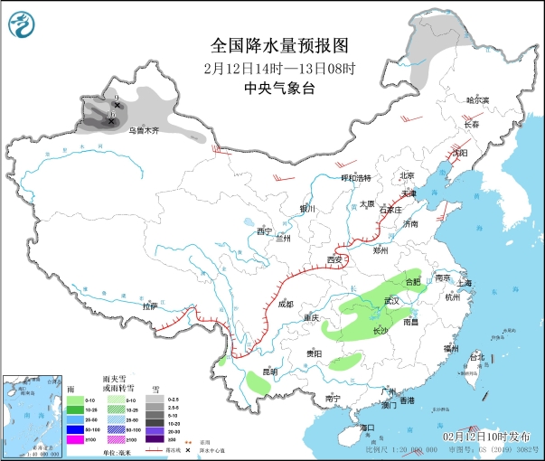 圖1 全國降水量預報圖(2月12日14時-13日08時)