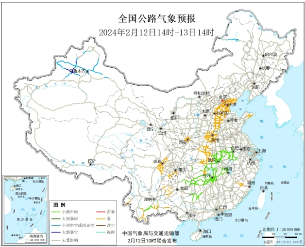 預計2月12日中午至13日中午,新疆北部、內蒙古東北部等地部分道路受小到中雪影響,新疆伊犁河谷等地局部路段受大到暴雪影響;河南東南部、湖北中部、湖南北部、安徽西部、江西西北部、雲南南部、貴州東北部、廣西北部等地部分道路受小雨影響。另外,陜西中部、北京東南部、天津、河北中南部、山東北部、河南西部、湖北中部、湖南北部、福建西部、重慶西南部、四川中東部、貴州西部、雲南南部等地部分道路受霧影響能見度低(見圖3,附件1)。