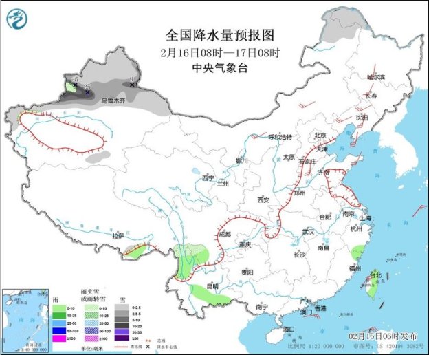 圖1 全國降水量預報圖(2月15日14時-16日08時)