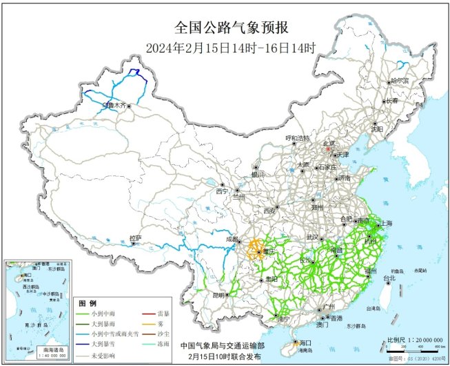 預計15日中午至16日中午,新疆北部、西藏東部和南部、川西高原中部、內蒙古東北部、黑龍江北部等地部分道路受小到中雪或雨夾雪影響,新疆阿勒泰地區、伊犁河谷局部路段受大到暴雪影響;江南、西南地區東部、廣西等地部分道路受小到中雨影響。另外,重慶西南部、四川東部等地部分道路受霧影響能見度低(見圖3和附件1)。