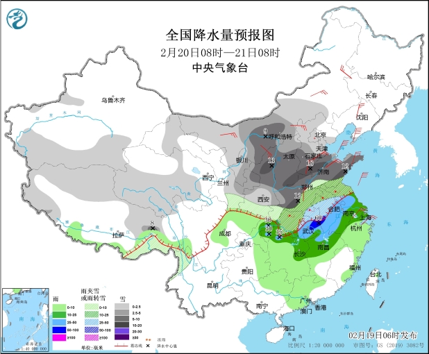圖1 全國降水量預報圖(2月19日14時-20日08時)