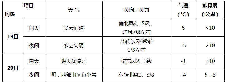 受冷空氣影響,預計19日至20日,北京地區有大風和寒潮天氣,其中19日白天至前半夜有4、5級偏北風,陣風7級左右,20日以陰為主,夜間西部山區有小雪。該期間氣溫明顯下降,北京地區白天最高氣溫5~-1℃,夜間最低氣溫-5~-4℃。具體預報見附表。