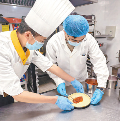 上午8點20分,記者提前來到烘焙店,趕在送餐前先“練練手”。32平方米的烘焙間裏,設備擺放有序。“比薩怎麼做?”“先搟皮,再把各種餡料撒在表面,烤箱一熱就能出爐。”後廚師傅席愛國答道,“面餅邊緣要多鋪點配料,保證旅客一口咬下去,什麼配料都能吃到。”
