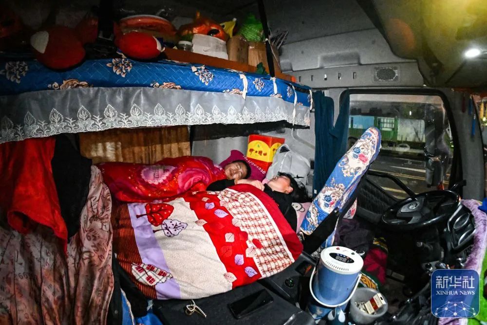 平日裏,孔令建夫婦主要在杭州往返武漢周邊運貨。臨近春節,許多工廠已放假,長途貨源不太好找,夫妻倆就每天刷單尋找短途貨源,一連幹了好幾天,“離過年還有些天,現在能掙就再掙點”。為了節省開支,他們一年到頭都吃住在車上,“車就是我們的第二個家”。