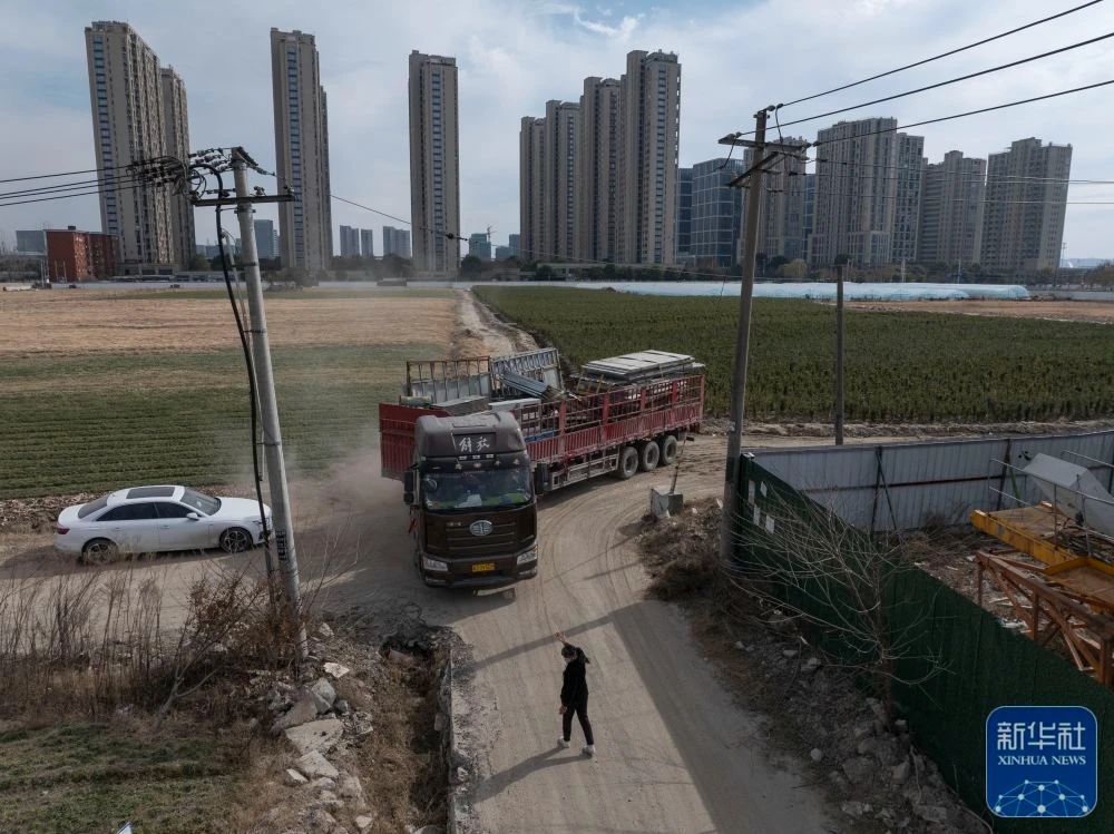 1月16日,孔令建夫婦在杭州市蕭山區的一處建築工地裝運貨物後,妻子王艷青指揮孔令建拐彎(無人機照片)。