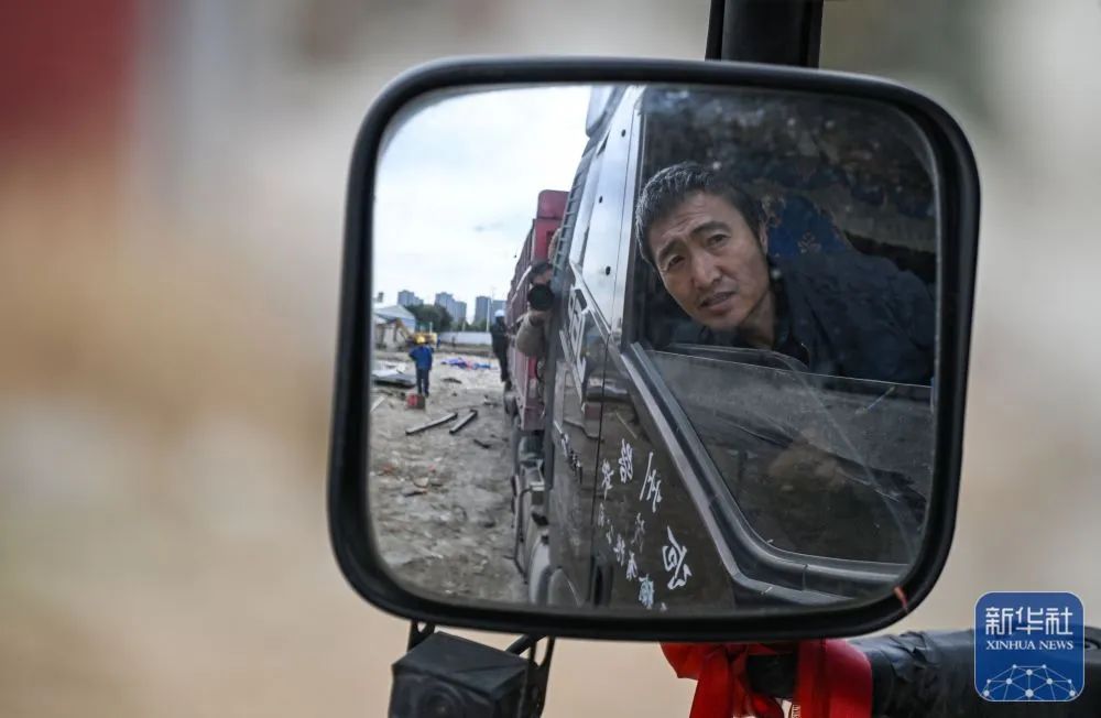 1月16日,在杭州市蕭山區的一處建築工地,孔令建通過後視鏡了解裝貨情況。