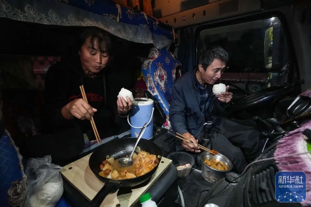 貨車司機的生活以4個小時為單位劃分。按規定連續行車4個小時必須強制休息至少20分鐘。手扶方向盤時,無論白天黑夜,孔令建雙眼始終注視前方,妻子王艷青就在他一旁幫忙,夫妻倆相濡以沫、溫暖相伴。