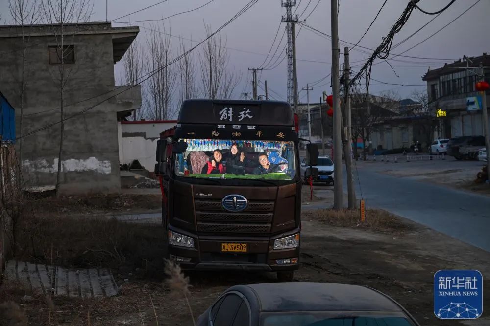 1月20日,孔令建夫婦回到村裏,夫婦倆和小女兒在貨車駕駛室裏合影。