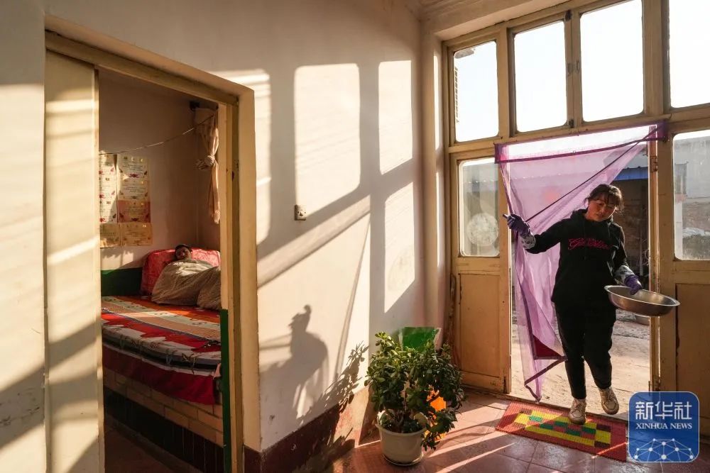 1月20日,回到家中,疲勞的孔令建(左)躺在炕上休息,妻子王艷青還在一旁忙碌。