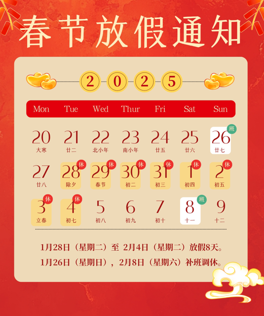 2025年春節假期時間為