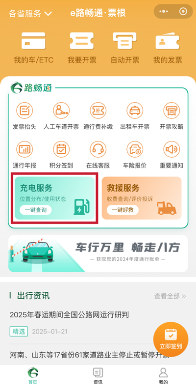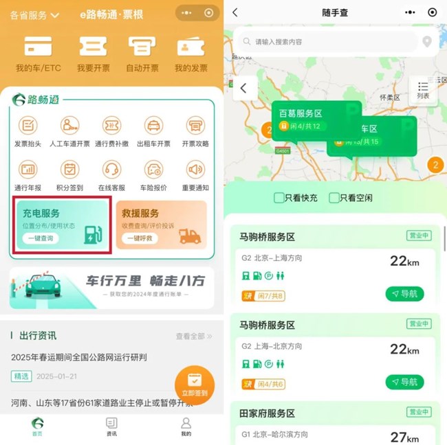 搜尋充電樁:當你行駛在高速公路上,急需尋找充電樁時,只需打開“e路暢通”小程式,進入服務頁面,點擊“充電服務”選項,系統會立即為你展示離你最近的充電設施位置。