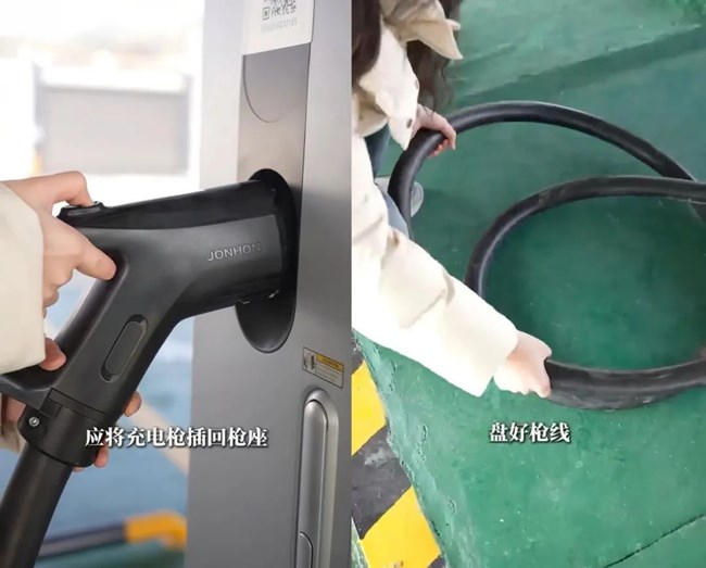 充電後:確認充電樁停止工作後再拔出充電槍;將充電槍整理好放回充電口;盤好槍線;並將電動車充電口封好。