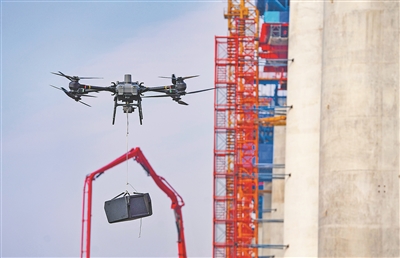 杭州灣跨海鐵路大橋施工現場,無人機正在運送工程物資。