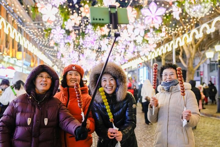 2025年1月30日,遊客在哈爾濱中央大街上手持糖葫蘆自拍。新華社記者 王建威 攝