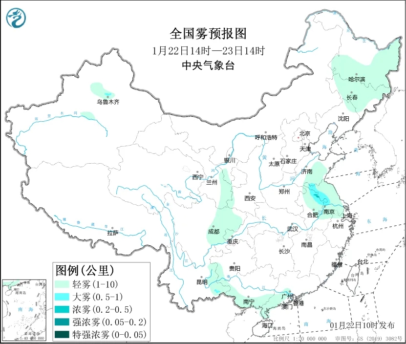 1月22日夜間至23日早晨時段,江蘇西部、安徽東北部、新疆天山北坡等地的部分地區有大霧天氣,局地有能見度低於200米的強濃霧(見圖1)。