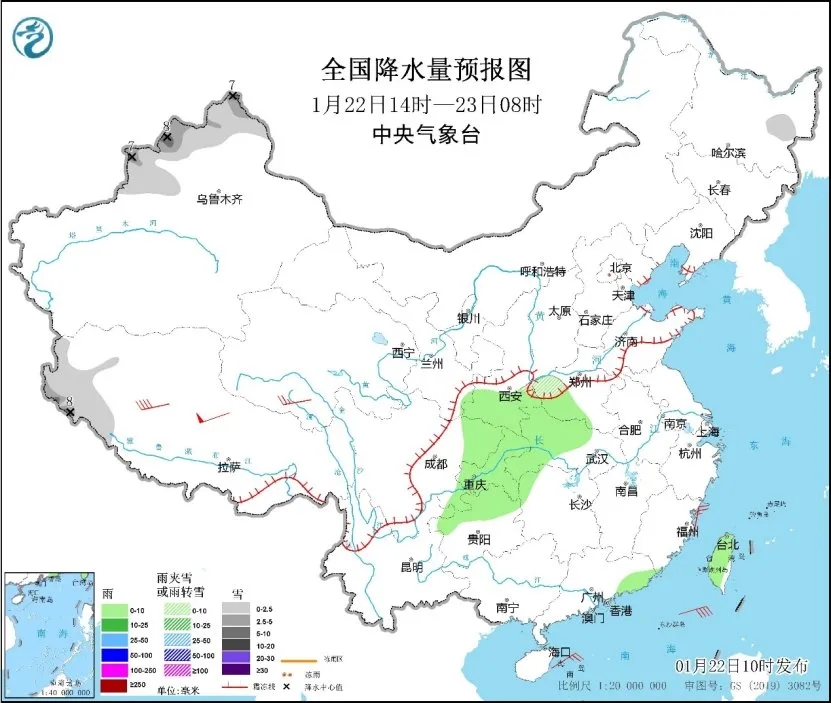 圖2 全國降水量預報圖(1月22日14時至23日08時)