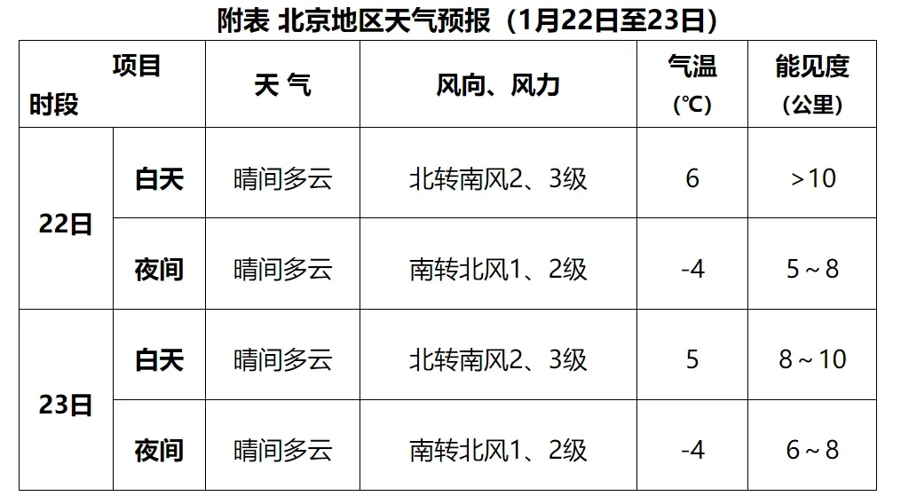 預計,22日至23日北京地區天氣為晴間多雲。該期間大氣擴散條件及能見度轉差,夜間有輕霧;白天最高氣溫6~5℃,夜間最低氣溫-4℃左右(見附表)。